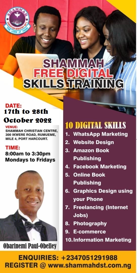 Shammah Digital Skills Traning is an initiative of Shammah Christian Ministry Int'l with Headquarters in Alesa, Eleme, Rivers State, Nigeria. The training is to empower youths to maximize the internet to generate alternative income legally rather than resort to cyber fraud and other negative vices currently plaguing our nation and indeed the world at large.